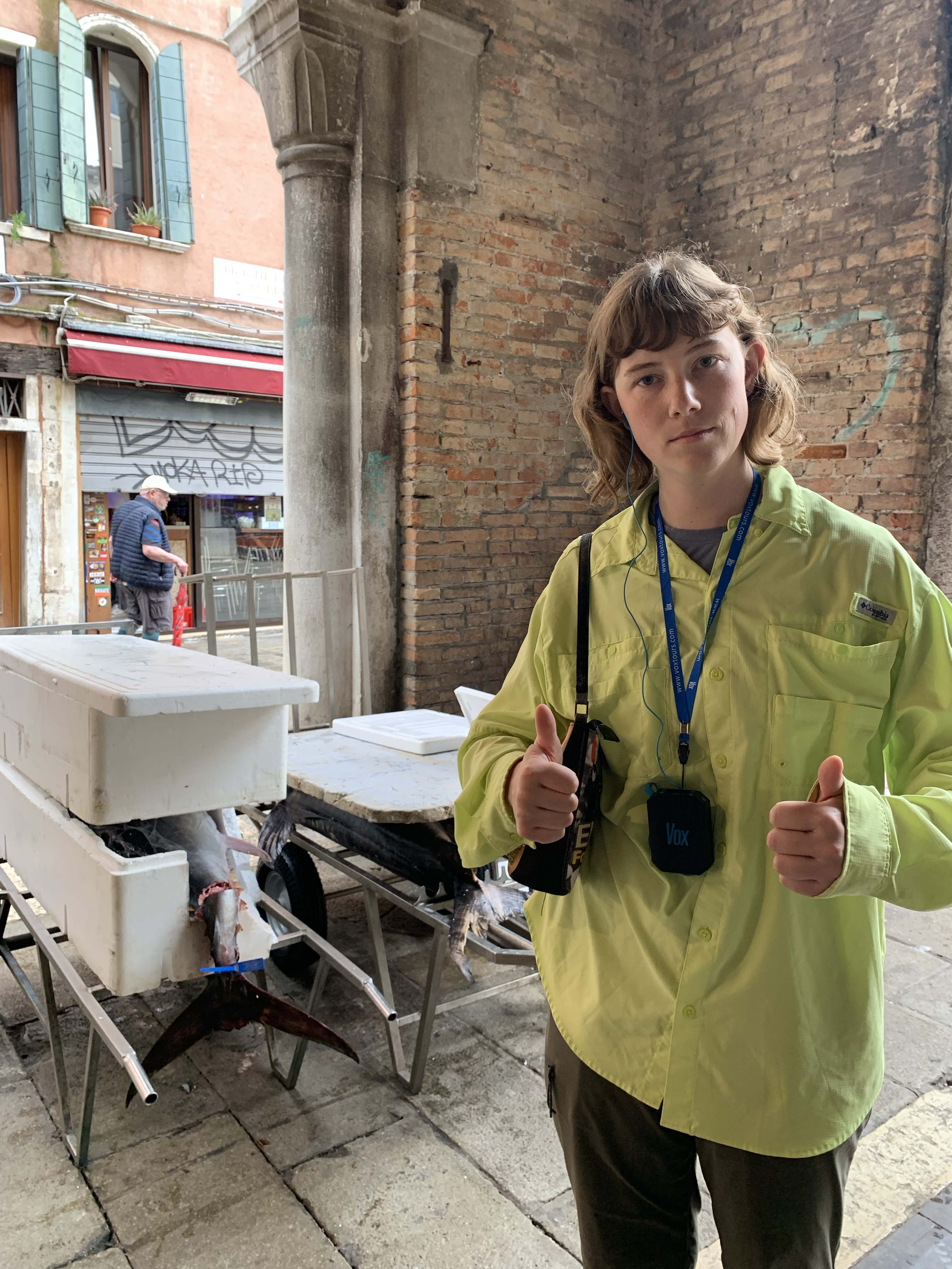 👣 We started our day with a historical backstreets walking tour with local guide, ending in St. Mark’s Square. We saw the farmer's market (pictured: squid on the floor) and stopped for coffee.