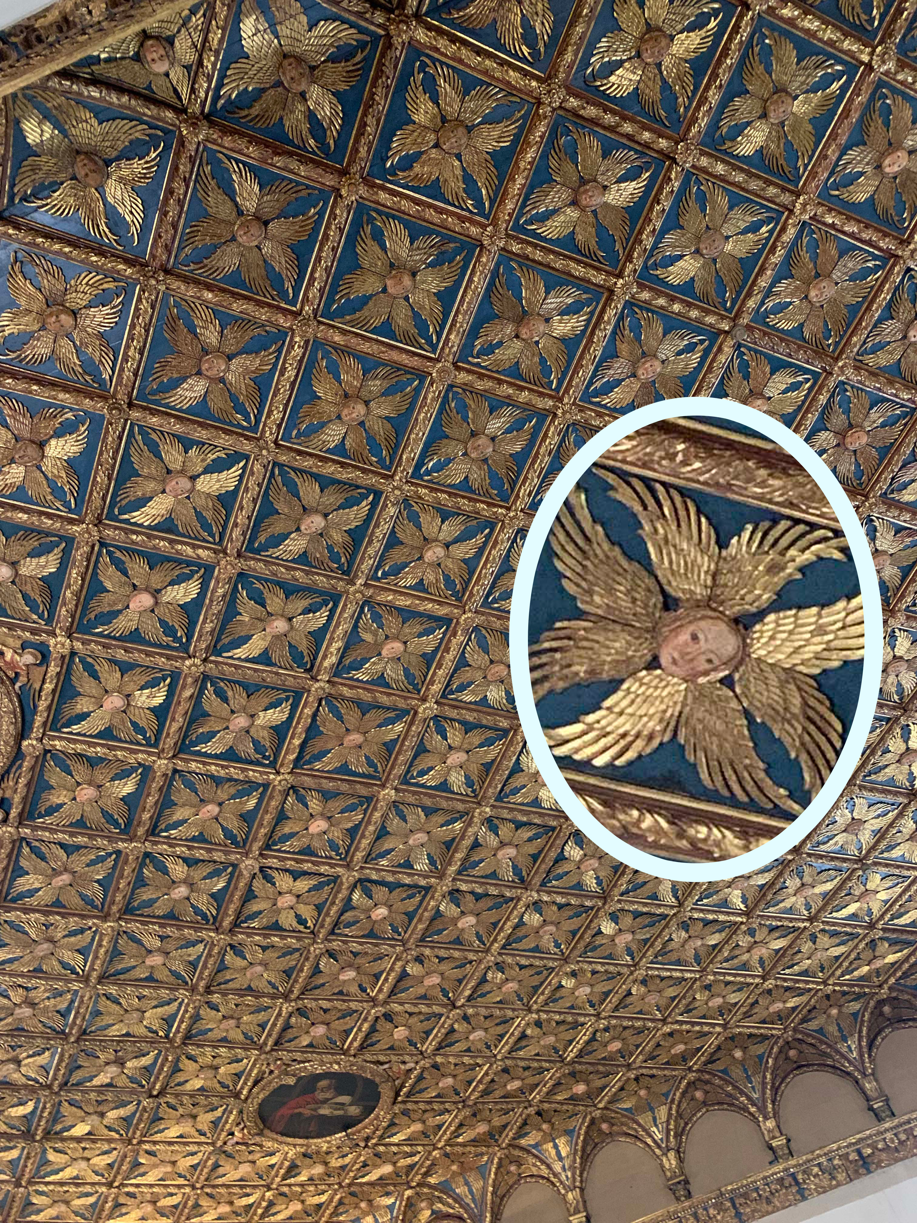 The ceiling of the First Hall was covered in angels by Marco Cozzi in about 1470. Serifs are angels with no bodies—just heads with wings!